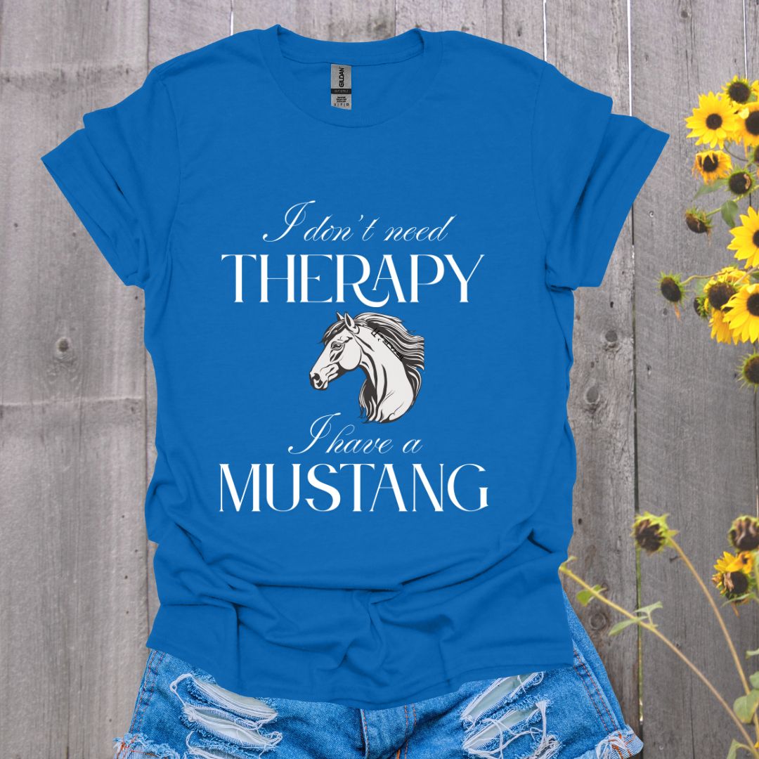 I don’t need therapy—I have a mustang 🐎💆‍♀️ This soft tee is perfect for wild-hearted riders who find peace in the saddle. Mustang love, trail-tested. #MustangHorse #HorseTherapy