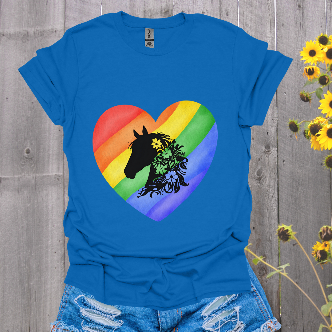 This horse-themed T-shirt features a rainbow heart design with a horse with flowers in their mane. Perfect for horse lovers and those who appreciate a touch of whimsy in their wardrobe. Ideal for casual wear or as a statement piece to brighten up any outfit. Suitable for everyone and made with durable, smooth fabric perfect for printing.