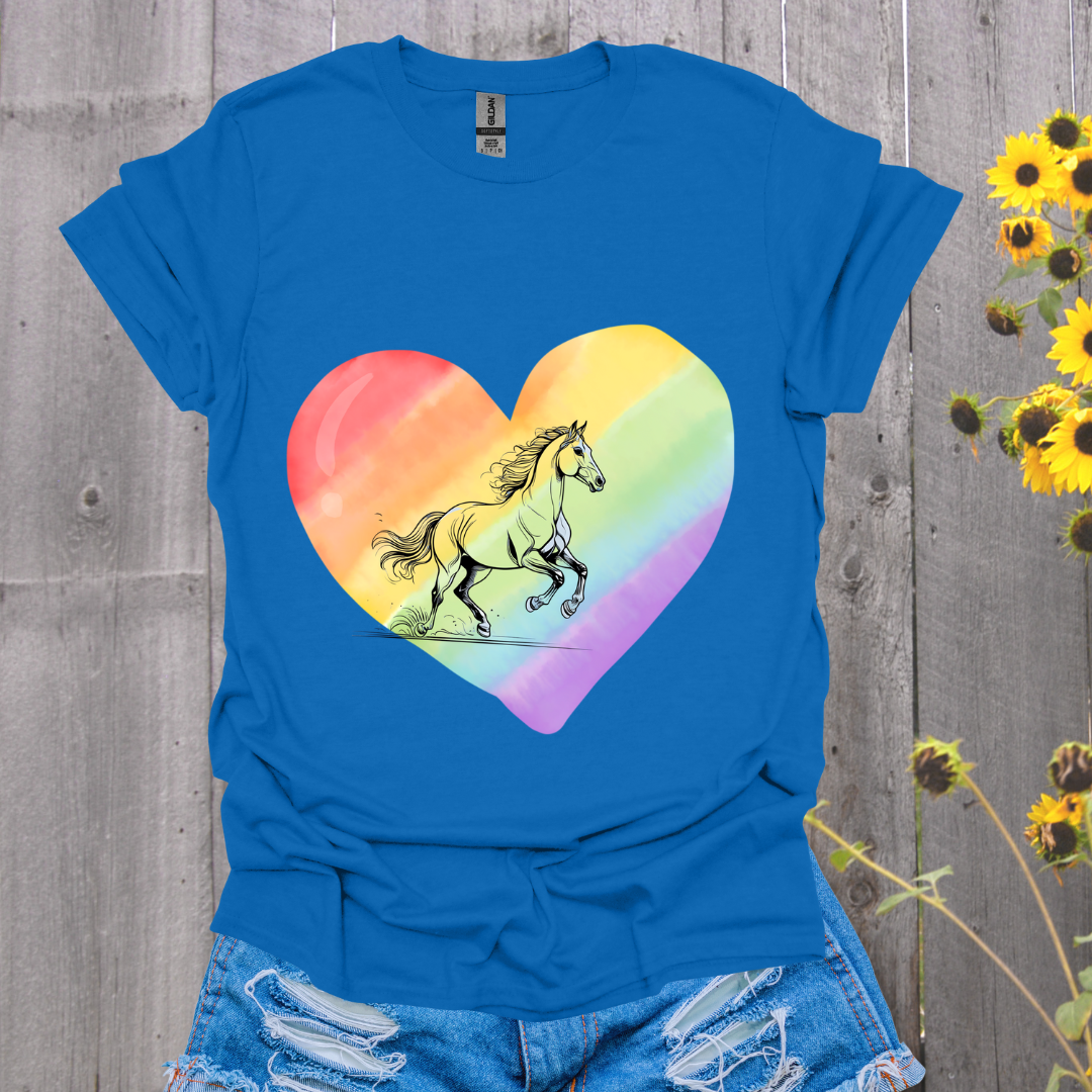 A unisex softstyle T-shirt featuring a vibrant rainbow heart design with a heart, perfect for those who appreciate colorful and unique apparel. This shirt is ideal for casual wear or as a statement piece for horse lovers and supporters of LGBTQ+ rights. It's a great option for Pride Month celebrations or as a gift for friends and family.