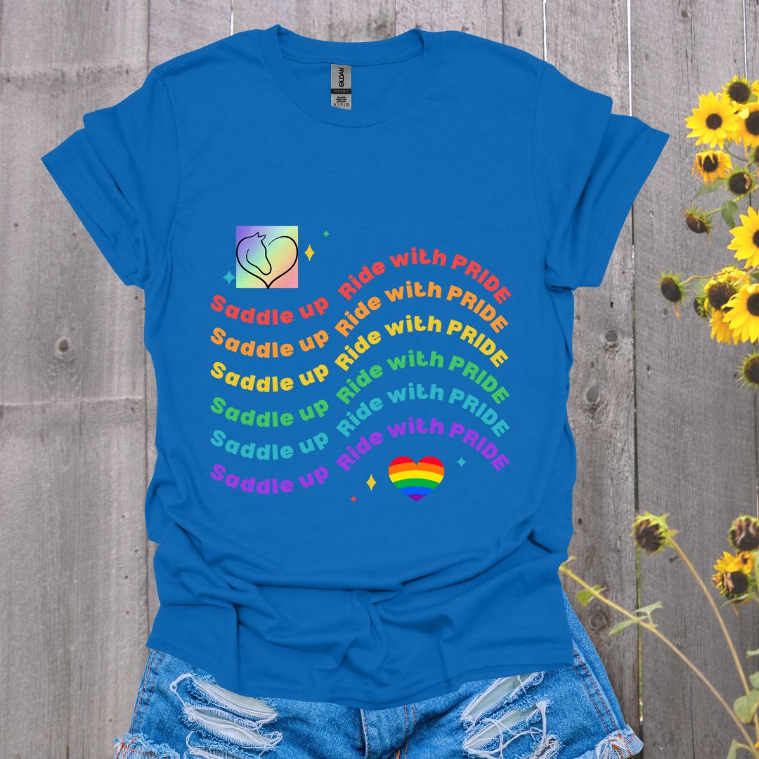 Saddle Up Ride With Pride horse t-shirt supporting pride month and LGBTQ horse-riding community. This unisex softstyle t-shirt is made from 100% ring-spun cotton, providing a lightweight and comfortable feel. The classic fit and crew neckline offer a versatile style suitable for any occasion, whether formal or semi-formal. Perfect for adults looking to show their support during pride month and LGBTQ events.