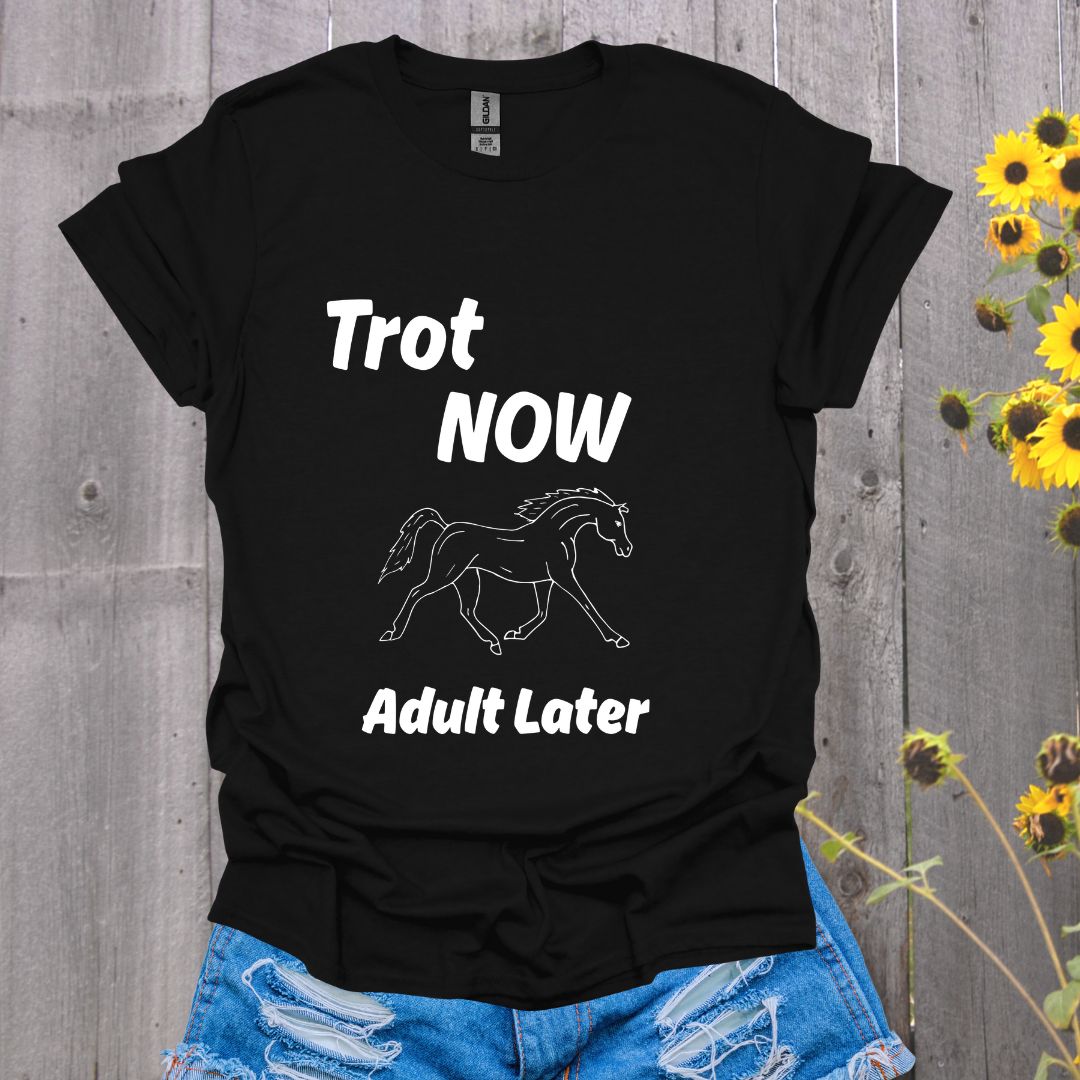 Adulting? Neigh. 🐎💨 Our “Trot Now, Adult Later” tee is for riders who’d rather be in the saddle than stuck adulting. #HorseLife #TrotNowAdultLater #EquestrianHumor #BarnVibes #HorseGirlsForever
